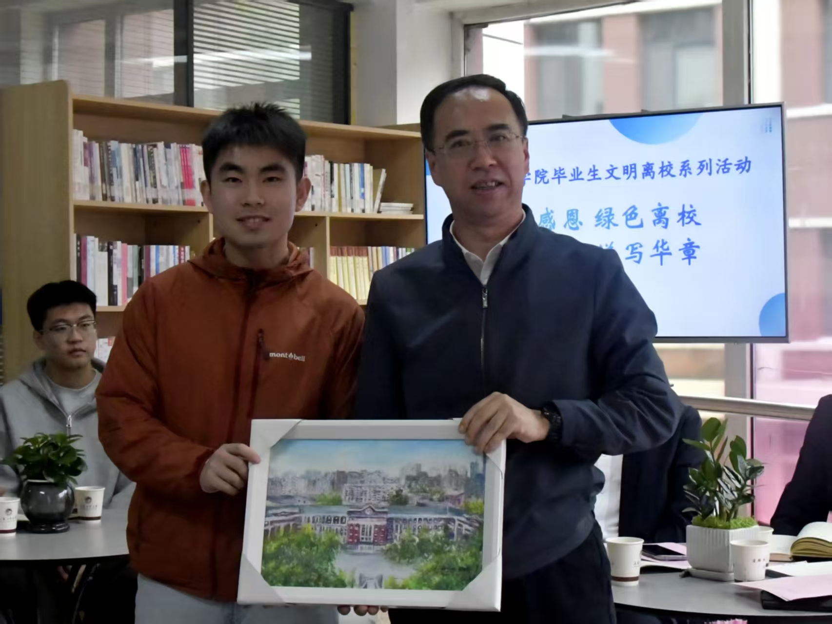 会上,参会领导向毕业生代表赠送了礼物,毕业生们则向母校赠送了精心制作的产品设计展板及临摹学校主楼的油画作品。