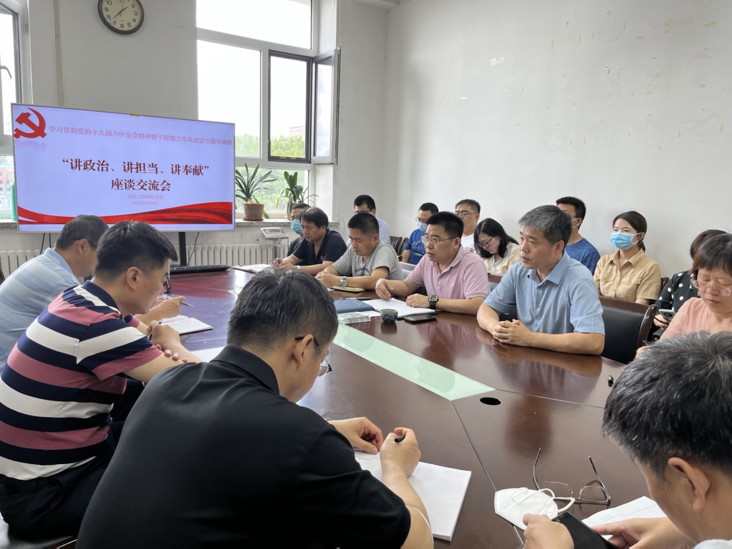 党委在1387会议室召开学习贯彻党的十九届六中全会精神暨干部能力作风建设专题培训班“讲政治、讲担当、讲奉献”座谈交流会。会议采用线上线下同步进行,班子成员、系(中心)党支部书记、主任参加了线下会议,其他党员参与线上会议。会议由党委书记李奇涵主持。