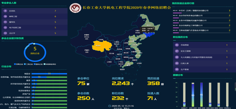 本次网络招聘会邀请了人本集团、宁波敏实汽车零部件技术研发有限公司、上海龙创汽车设计股份有限公司、深圳市景旺电子股份有限公司、观致汽车有限公司、北汽福田汽车股份有限公司等75家省内外企业进行招聘,共提供涉及机械工程、机械电子工程、车辆工程、计算机、商务管理、教育等领域的工作岗位2243个,有245人登录招聘会投递简历323份,参会毕业生通过投递简历和微信对话形式与用人单位进行应聘交流。