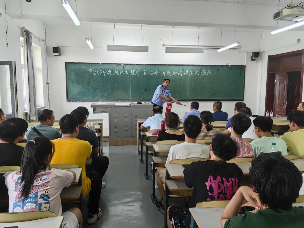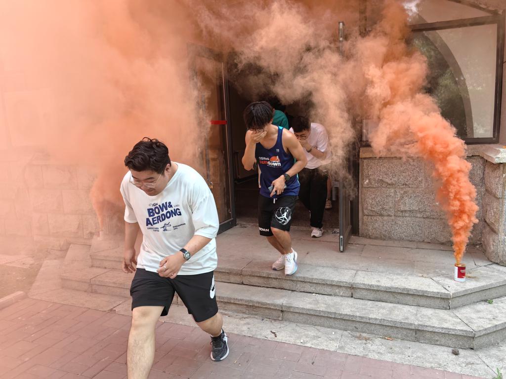 在演练前,靳朝晖等安全处防火科同志对学院师生进行了消防安全知识培训。接着在安全处工作人员的示范指导下,在主楼机电侧开展疏散逃生、初起火灾扑救等科目的消防演练活动。14时许,随着现场指挥员“演练开始”口令,教学主楼西侧突发火情,在教师安全引导员的指引下,师生从楼内快速有序地疏散到安全区域。