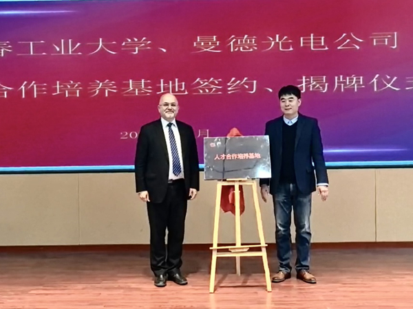 在仪式上,院长郝兆朋与曼德光电公司总经理纳法瑞共同签署校企合作框架协议,双方共同为人才合作培养基地揭牌。