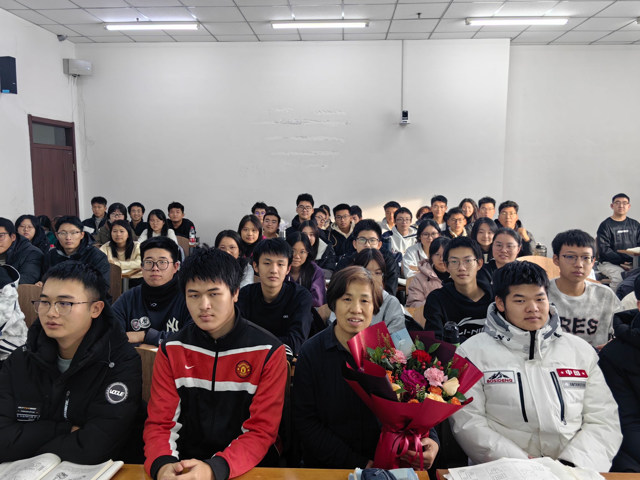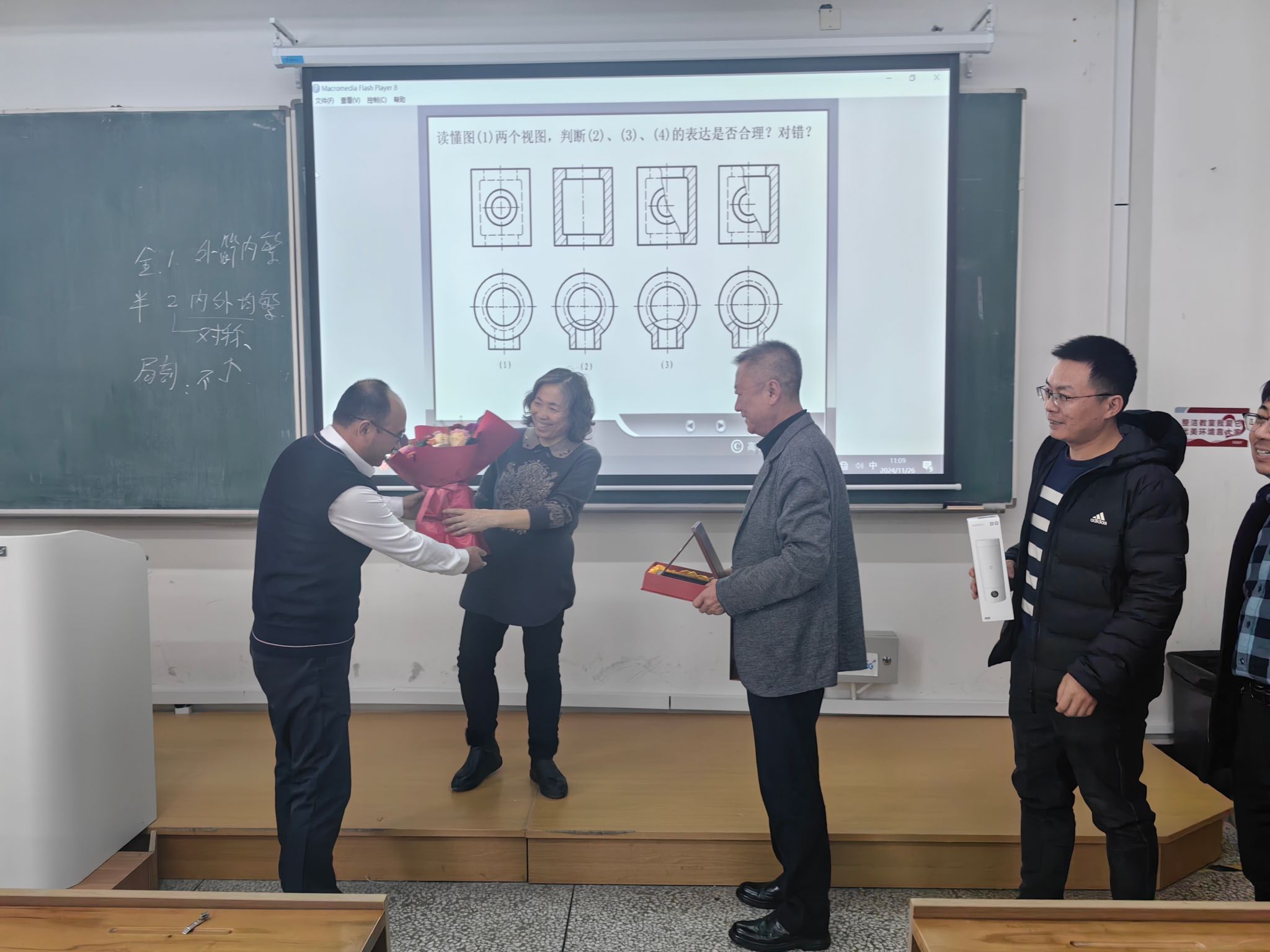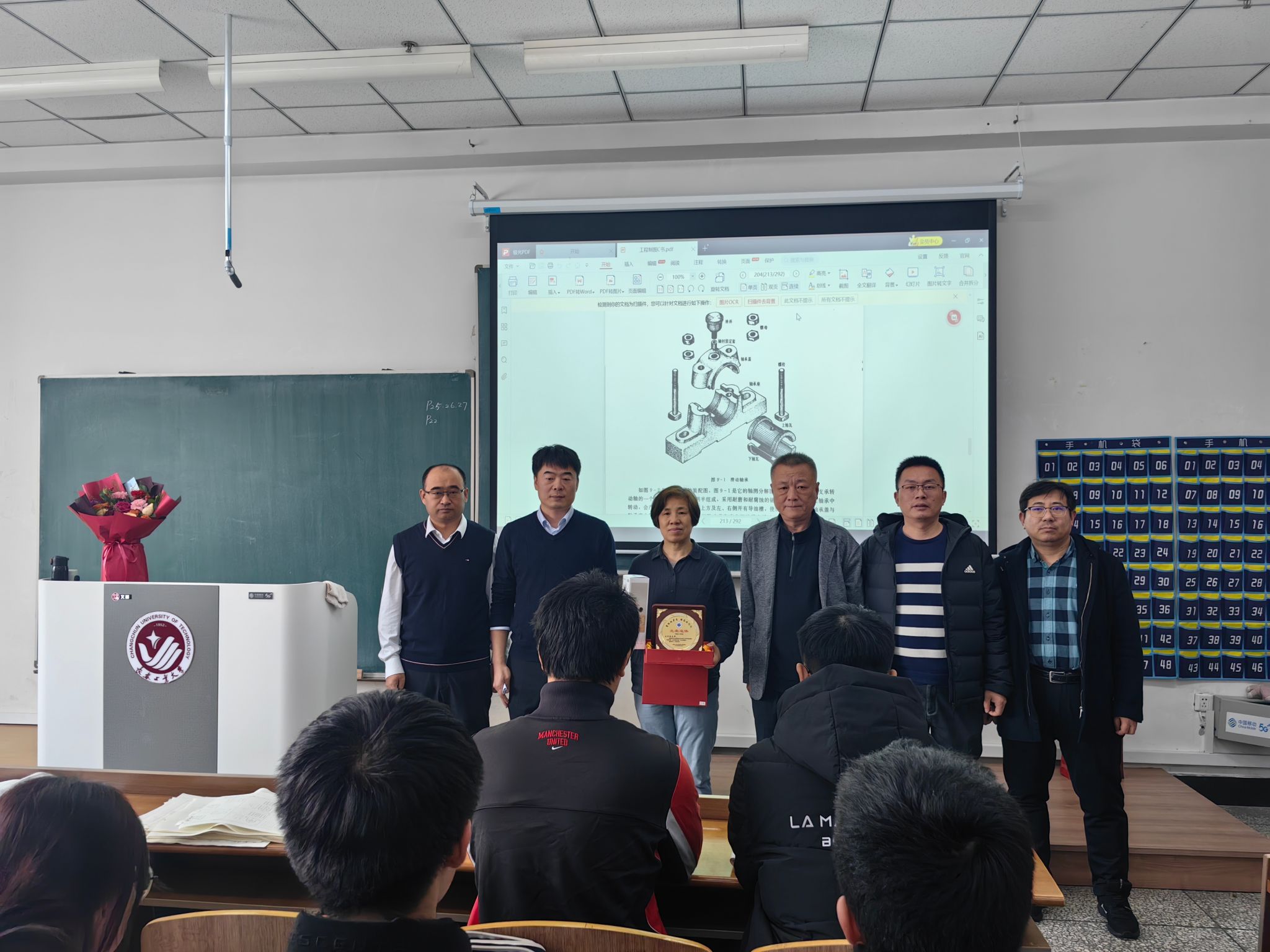 为其精心筹备了一场温馨的“最后一课”荣休仪式。学院党委书记张利军、院长郝兆朋、副院长谷东伟、副院长卢明明、机械基础教学中心主任刘小勇一起来到课堂,与全体上课学生共同见证了这一光荣时刻并送上美好祝愿。