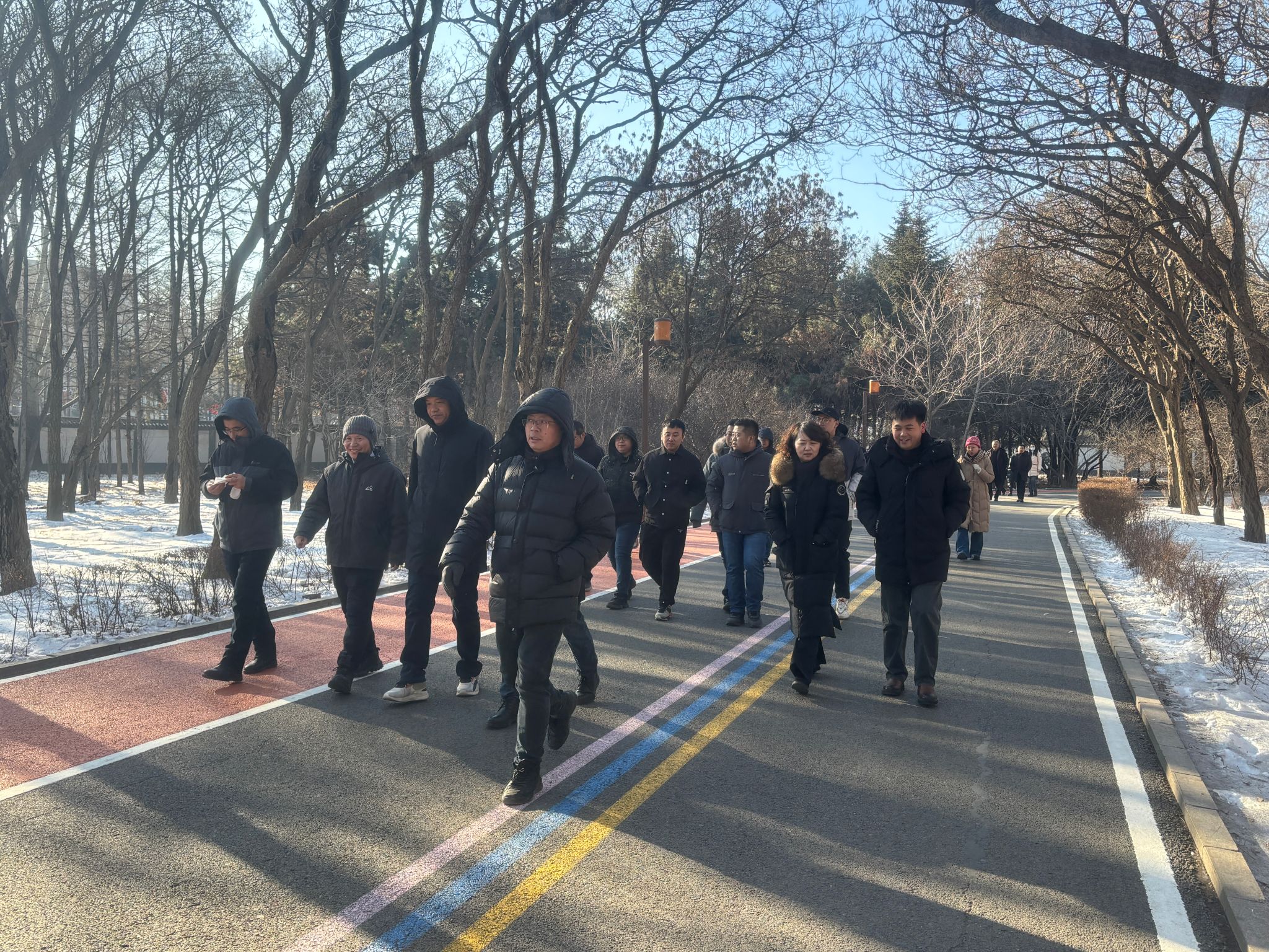 虽然深冬寒冷,也抵挡不住老师们积极参加活动的热情,12月13日中午12点近七十余名教师兴致昂扬地聚集在南湖校区主楼门前,合影后一起前往南湖公园,并沿园内健康步道徒步一周约1.8公里,期间大家边迈着轻快的步伐,观赏院内风色,边互相畅谈交流感情,呼吸着清新的空气,现场洋溢着热闹的氛围。
