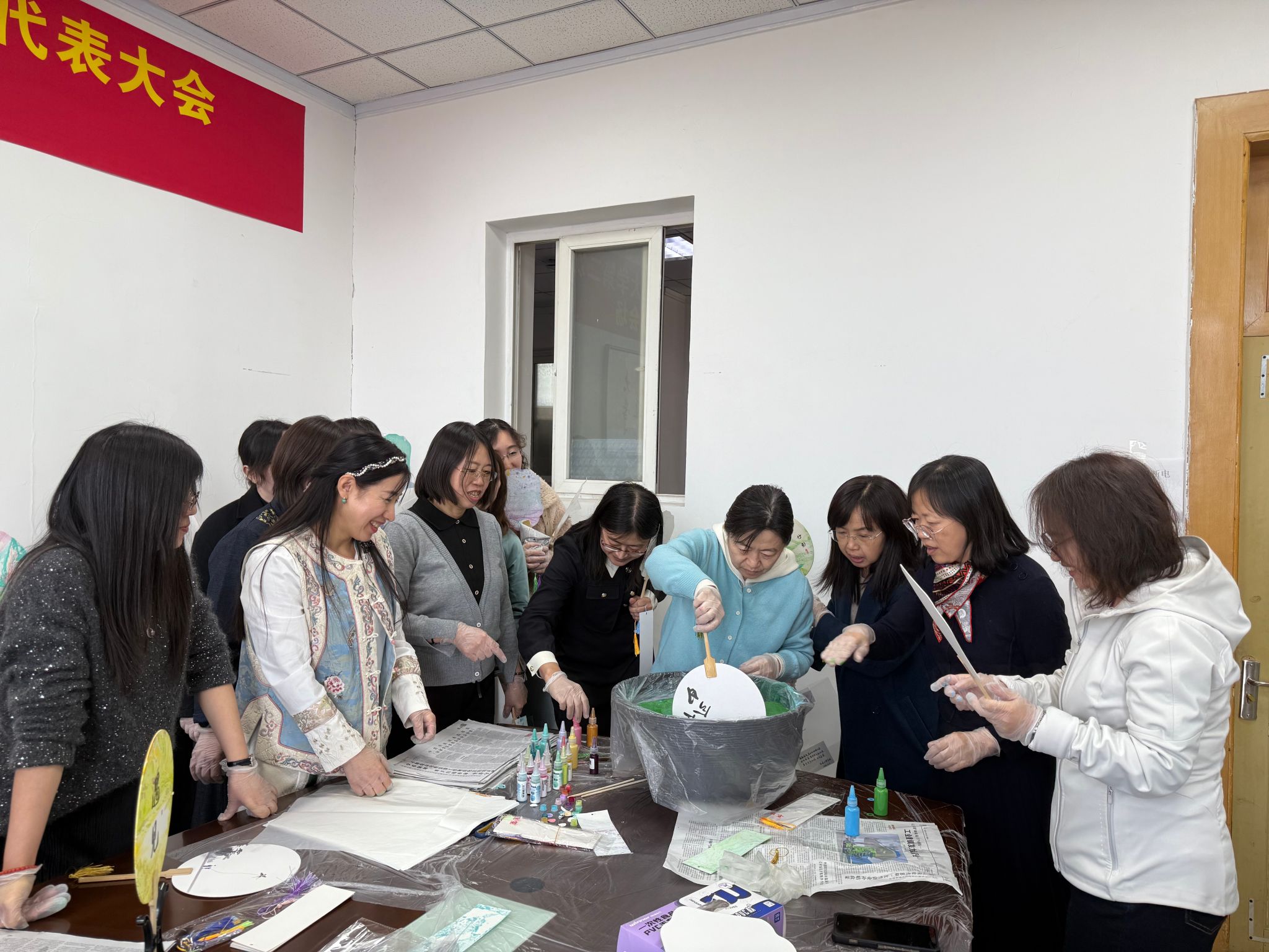 进入实际操作环节,老师们纷纷变身“艺术家”,亲自上手制作漆扇。大家纷纷挑选心仪的扇面图案和颜色,开始精心创作。现场气氛热烈,欢声笑语不断。老师们互相交流心得,分享经验,在互帮互助中共同进步。经过一个多小时的努力,一把把色彩缤纷、各具特色的漆扇作品逐一呈现。大家欣赏着自己的劳动成果,脸上洋溢着喜悦和自豪。活动最后,老师们手持亲手制作的漆扇合影留念,记录下这美好而难忘的时刻。
