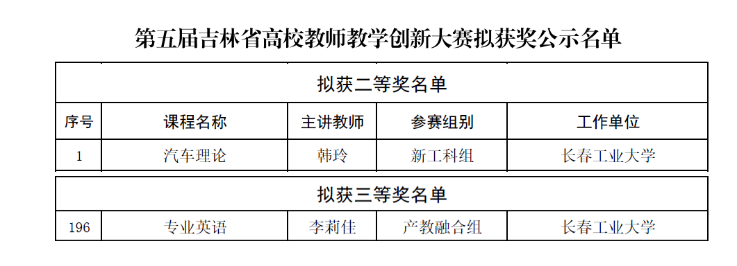 依据吉林省教育厅《关于第五届吉林省高校教师教学创新大赛获奖结果的公示》,吉林省共拟认定80个教师(团队)获一等奖、132个教师(团队)获二等奖、206个教师(团队)获三等奖,12所高校获优秀组织奖。韩玲老师依托《汽车理论》课程,凭借扎实的教学功底、创新的教学方法在新工科组中脱颖而出,荣获二等奖。李莉佳老师以《专业英语》课程为依托,将专业知识与实践应用巧妙融合,在产教融合组比赛中斩获三等奖。
