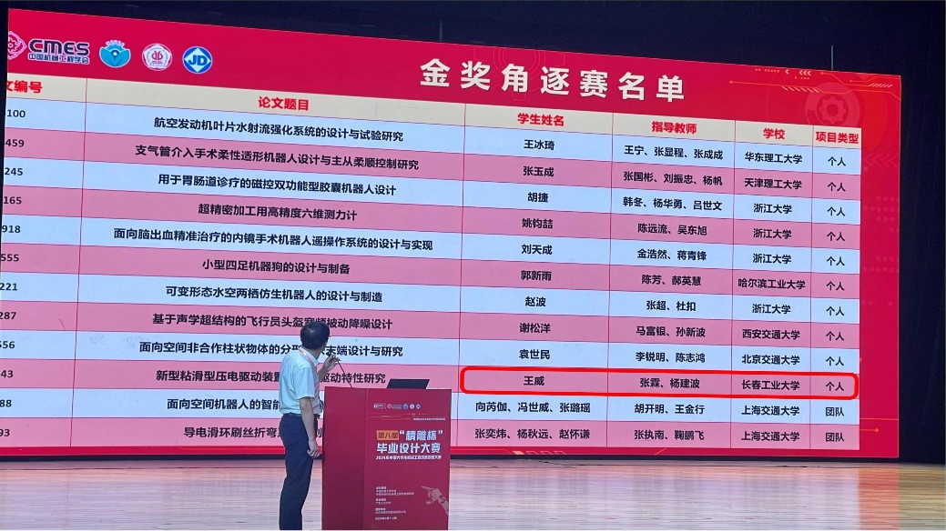 王威同学的作品《新型粘滑型压电驱动装置研制及驱动特性研究》(指导教师:张霖、杨建波)荣获个人赛银奖(全国一等奖)。
