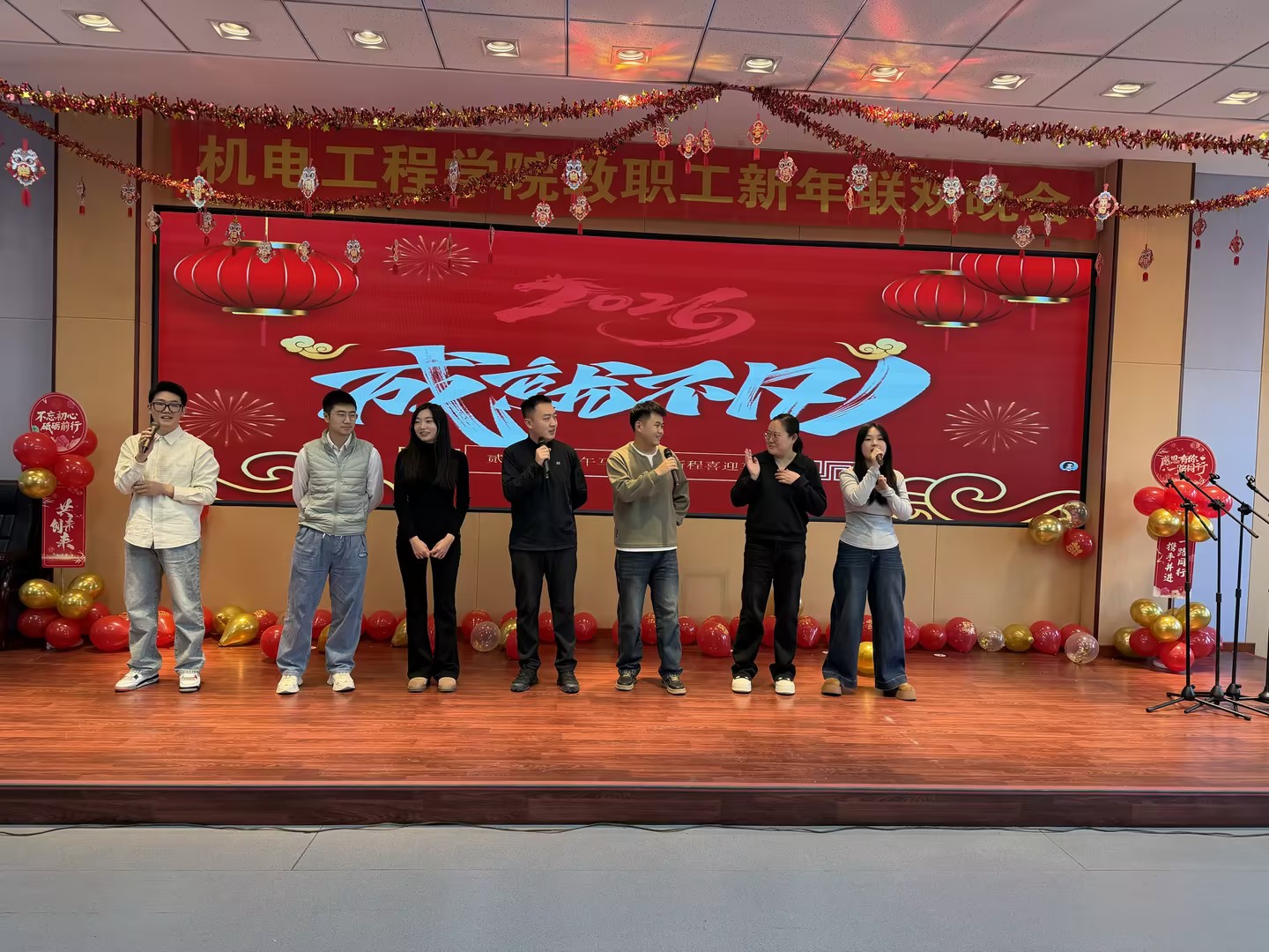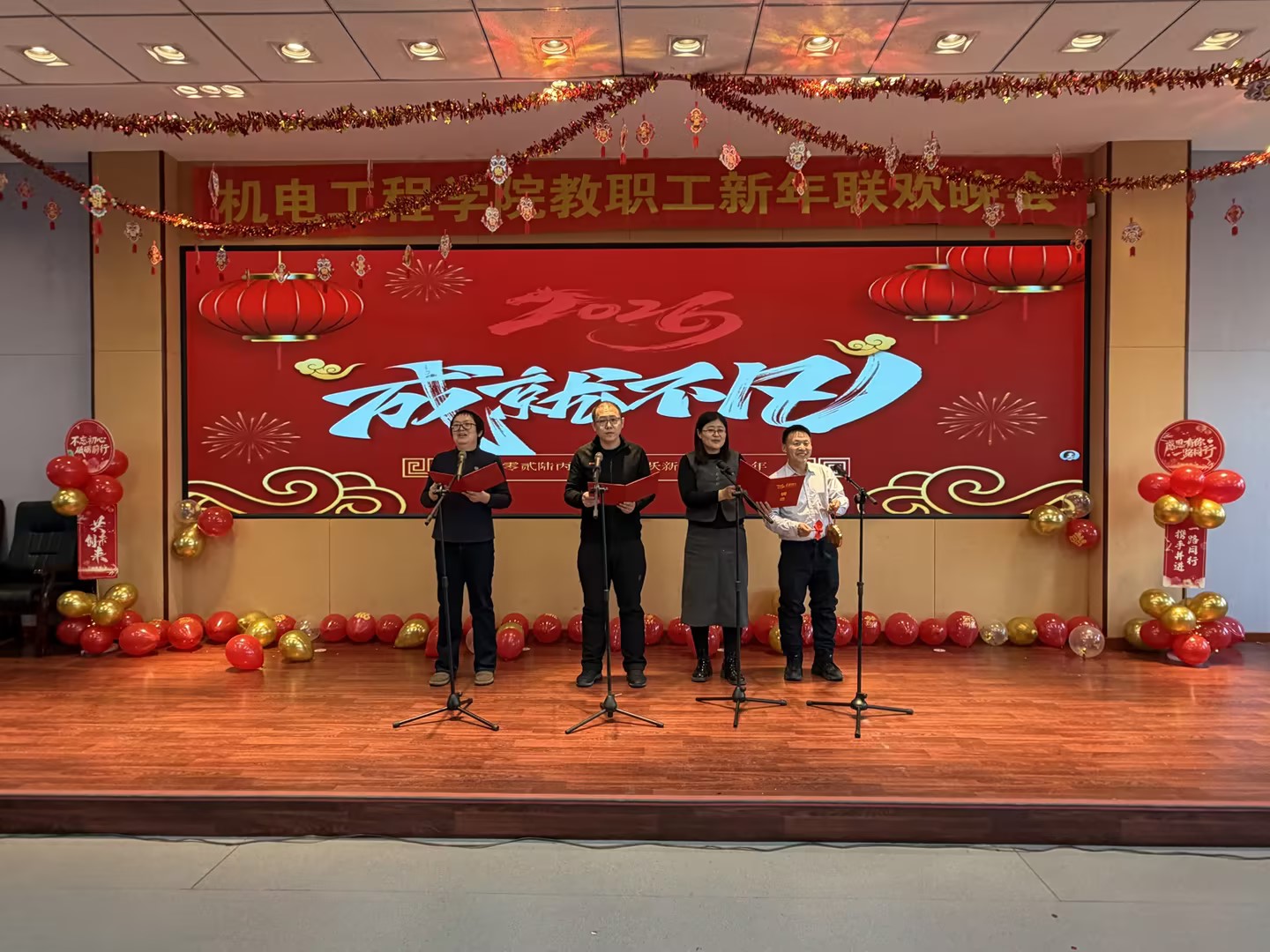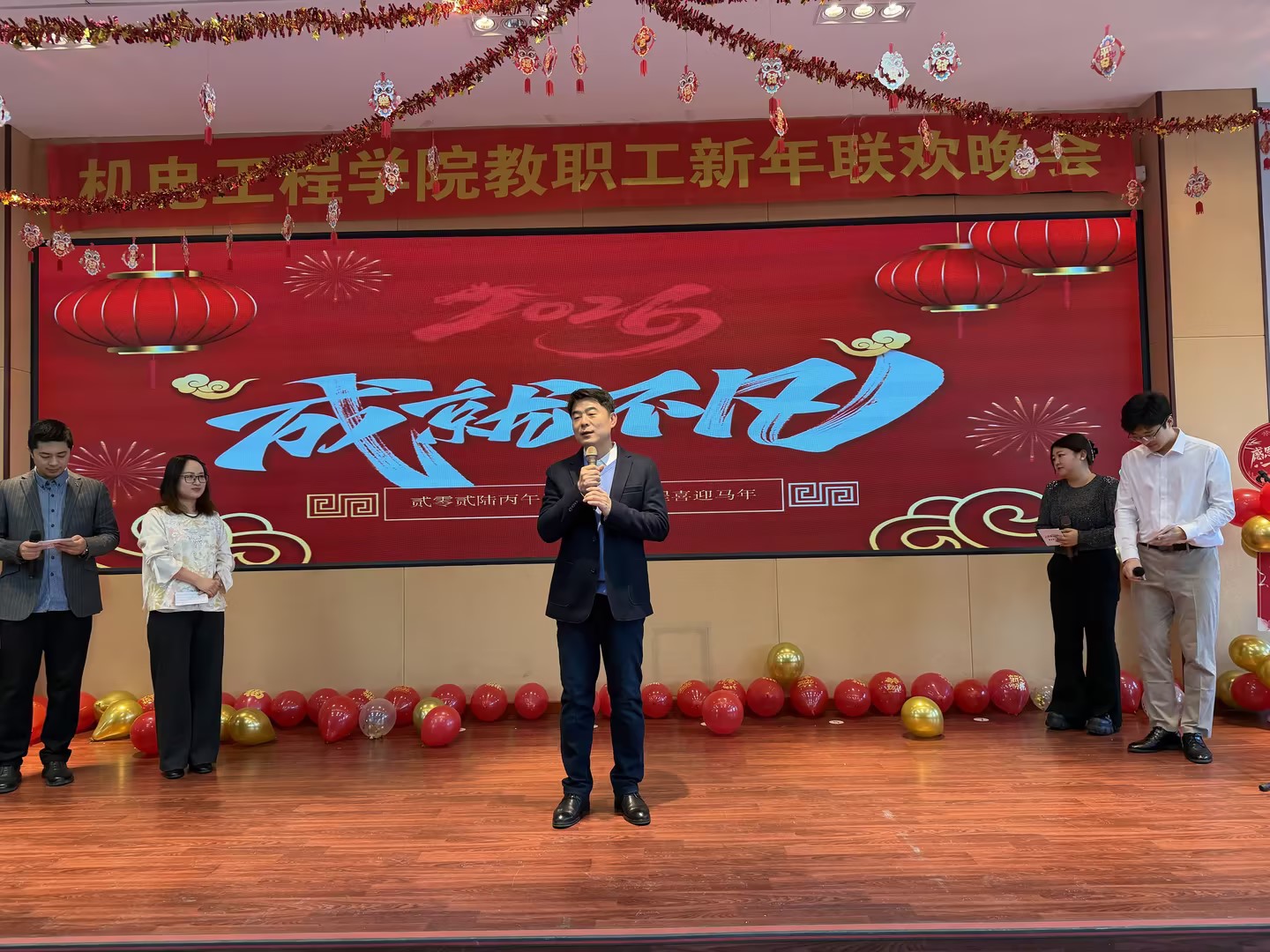 联欢会在学院院长郝兆朋的新年贺词中拉开帷幕。他回顾了2025年学院取得的丰硕成果,向全体教师的辛勤付出致以由衷感谢和崇高敬意,并向大家送上诚挚的新年祝福,祝愿学院在新的一年各项工作再创佳绩。