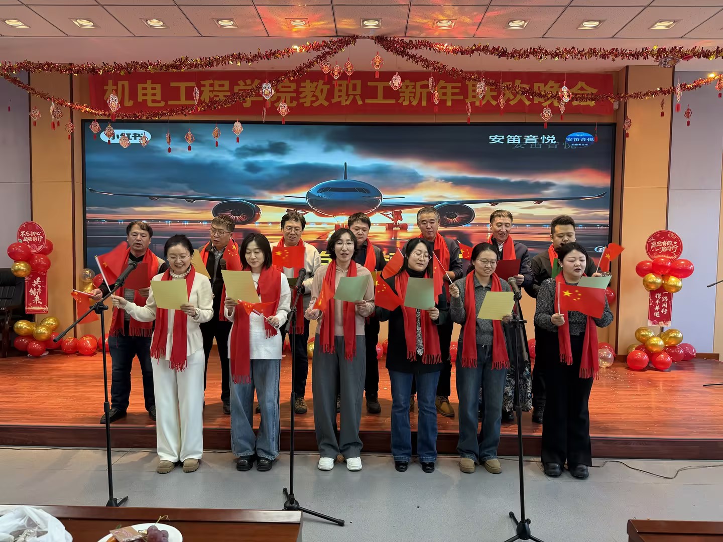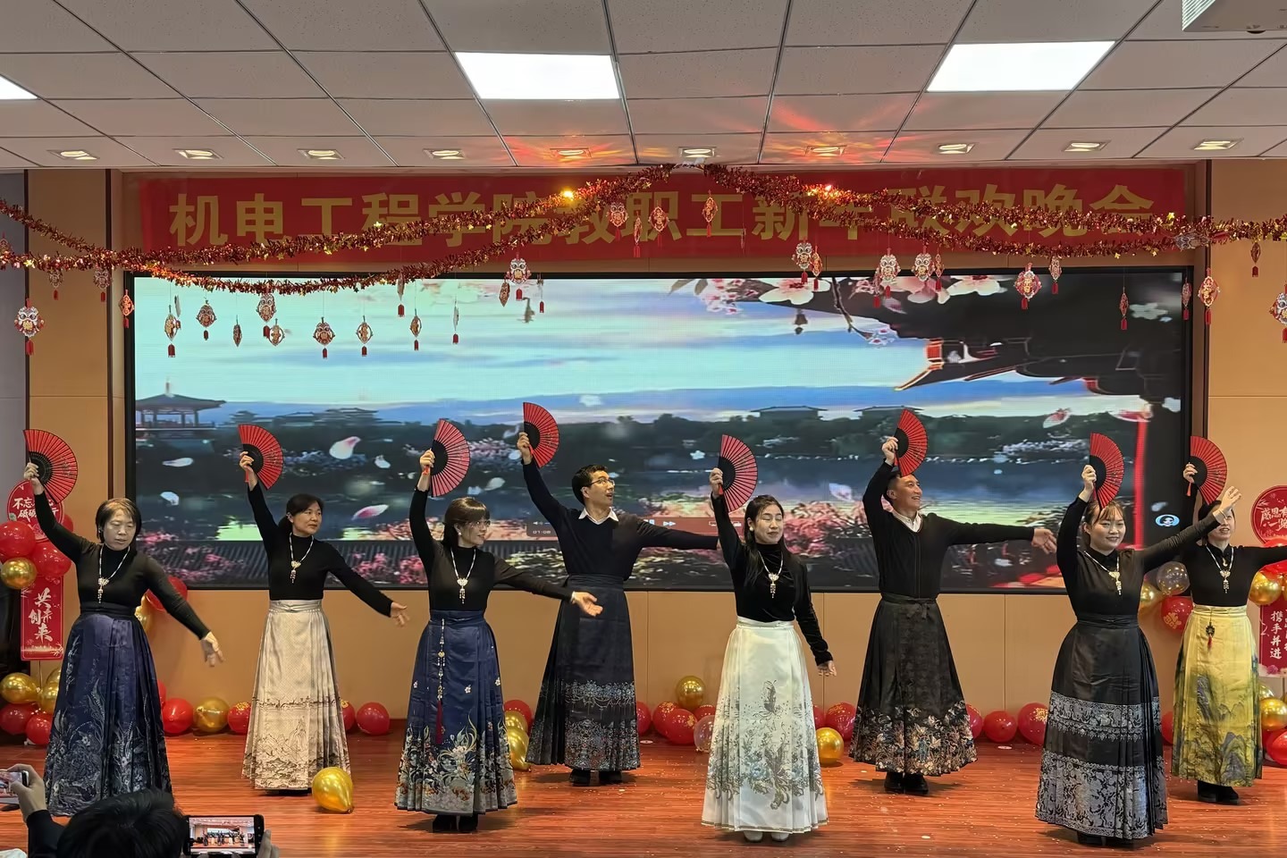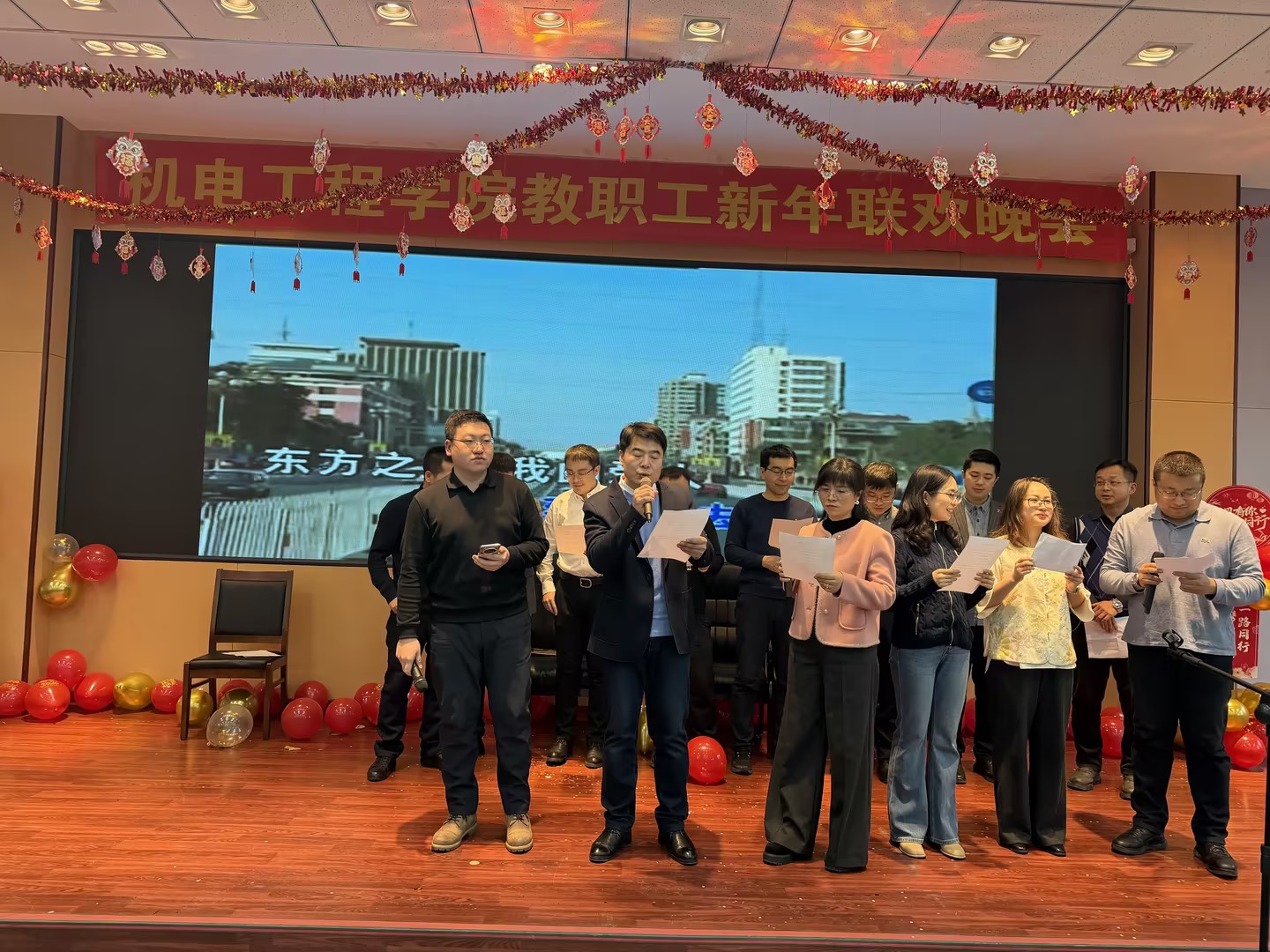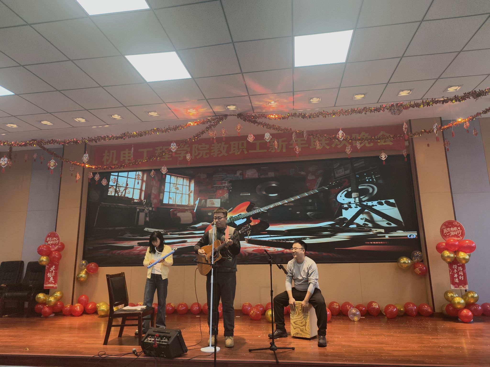 晚会节目形式多样、气氛热烈。既有青春洋溢的歌曲演唱,也有慷慨激昂、幽默诙谐的三句半表演;既有舞姿曼妙、引人瞩目的国风舞蹈,也有情感充沛的小合唱;既有热情洋溢、高潮迭起的乐队演出,也有经典传唱、气势恢宏的大合唱;更有笑声不断、创意十足的舞台剧。一个个精彩节目轮番登场,不断将现场气氛推向高潮,呈现了一场独具艺术魅力的视听盛宴,充分展现出我院教师多才多艺、充满活力的精神风貌。