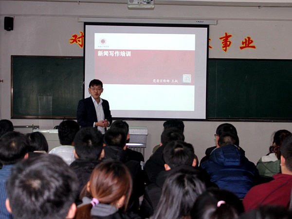 在学院会议室召开学院宣传工作培训会。本次培训会由校党委宣传部王权老师主讲,学院团委书记周巍、学生党支部书记杨楠以及学院团委、学生会、社团联合会通讯员参加了培训。