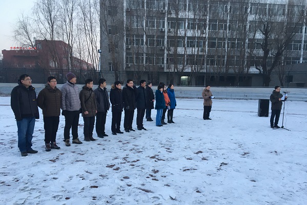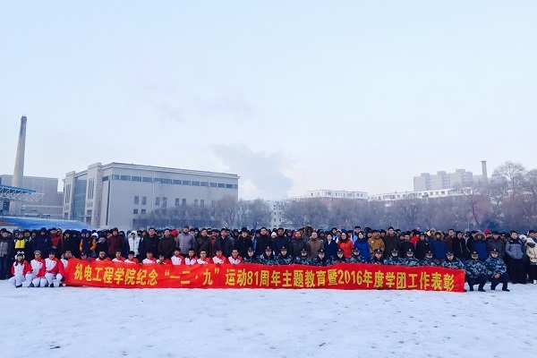 2016年度学团工作优秀集体和个人的决定》。校学生工作处副处长周文军、校团委副书记仲崇利等领导和老师共同为获得优秀班集体、学习标兵、优秀学生干部、创新创业先锋、文明大学生、双十佳大学生等荣誉称号的集体和个人颁发证书并与他们合影留念。学院学生会主席王翔作为学生代表宣读了“纪念一二九,立我报国之志”的倡议书。升旗仪式上,全国百炼之星李远东、校十佳自立自强大学生孟祥波、校社团联合会主席付嵩翔、院十佳优秀大学生古力加依娜.米兰组成的护旗方队首先入场,工作人员介绍了护旗手的成长事迹。两名国防生升旗手振臂一挥,全场1000余名师生一同高唱国歌,鲜艳的五星红旗在初升的阳光映照下冉冉升起,气氛隆重而热烈。