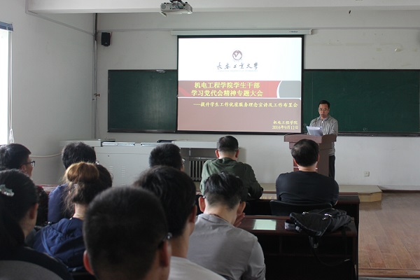 在四楼学生工作会议室召开“学生干部学习党代会精神专题大会暨提升学生工作优质服务理念宣讲及工作布置会”。学生工作办公室全体人员,全体学生党员、主要学生干部参加了会议。