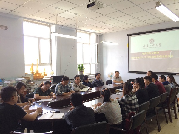 在学院资料室召开“提升学生工作优质服务师生座谈会”。学院党委副书记胡刃锋参加会议并讲话。学院各系党支部书记、全体辅导员和各年级学生代表参加了座谈会。座谈会由学院团委书记周巍主持。