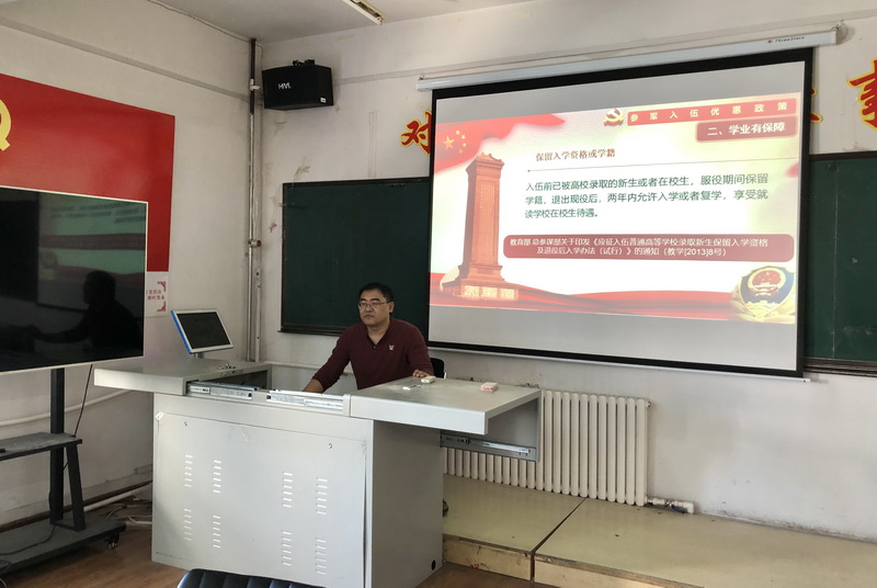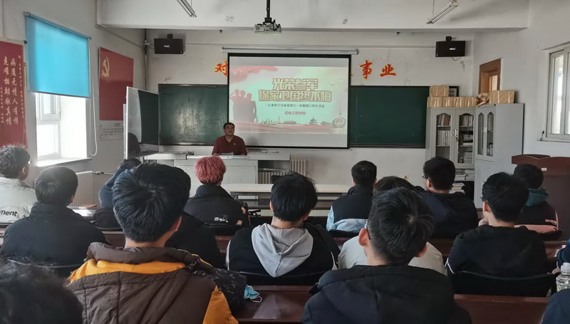 首先,宫磊结合国内外形势及十九届六中全会精神,引导学生要立志报国、精诚参军,积极献身国防事业。他指出,我党在十九届六中全会上提到在国防和军队健设上,人民军队要实现整体性、革命性重塑,重整行装再出发,要做到国防实力和经济实力同步提升。青年大学生应乘此东风应征入伍实现自己的强国志、报国梦,不负“请党放心、强国有我”的誓言。